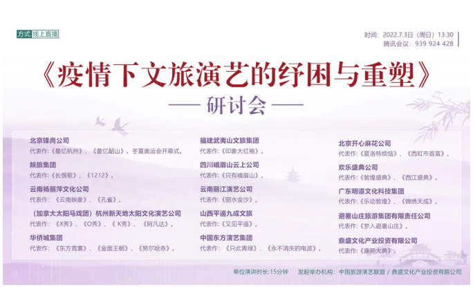 疫情是全人类的考题,中国给出了最佳答案。和其他行业一样,中国文旅行业勇于担当,致力于贡献自己的一份力量!把危机变成转机,是每一个文旅企业都必须面对的问题。2022年7月3日下午13:30,中国旅游演艺联盟、鼎盛文化产业投资有限公司共同发起《疫情下文旅演艺的纾困与重塑》线上研讨会,首次以线上直播的形式,在公司大会议厅成功举办。公司总裁梅洪主导了本次研讨会。