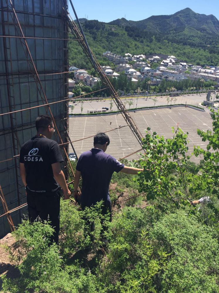 2020年6月14日,星期日,由公司副总陈清瑞带队,行政部副经理姚智勇、演艺中心副经理李云清、演艺中心安保部经理李鹏亮、演艺中心安保部主管张士达等检查小组人员,在园区山体开展一次排查整治安全隐患的专项行动。陈总对重点部位、重点线路进行现场查看,针对隐患处做出工作部署,要求广告牌拉线与固定点重新加固。增强重点线路的排查力量,并详细询问了防控措施。