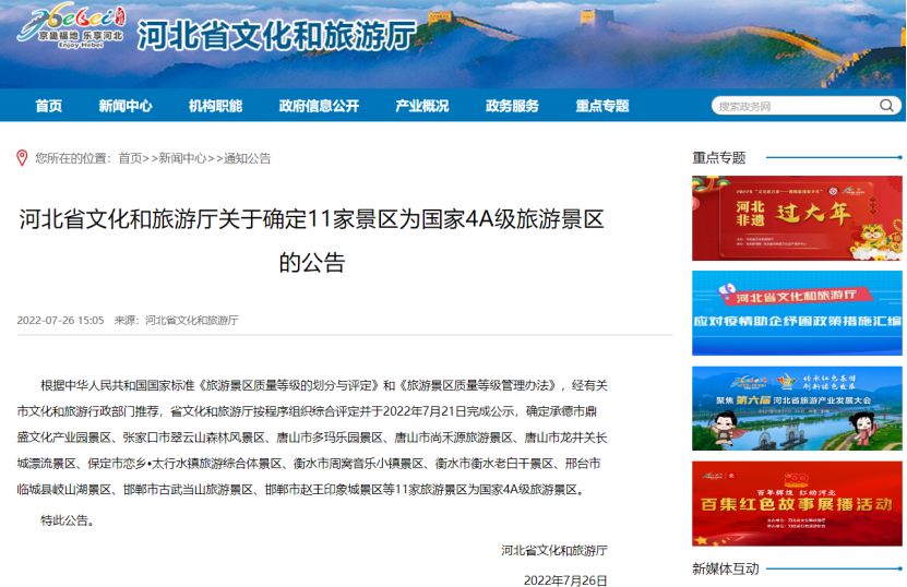 河北省文化和旅游厅7月26日最新公告!根据有关规定,经有关市文化和旅游行政部门推荐,省文化和旅游厅按程序组织综合评定,确定包含承德市鼎盛文化产业园景区在内的11家景区为国家级4A级旅游景区。