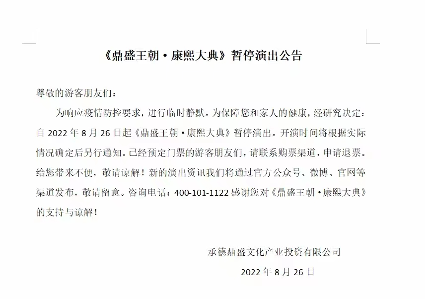 《鼎盛王朝·康熙大典》暂停演出公告