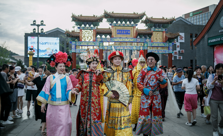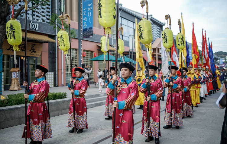 一是皇家盛宴,以“华”待人。皇承天德,紫塞明珠,承德的文脉源自皇家,绽于盛世,最值得品味与体验。皇家巡游环节复刻康乾盛世风华,演员们身着传统缂丝工艺织造的十二章纹黄袍与各色吉服,一针一线都是匠心匠作,一颦一动尽显天日之表,近距离展示玉龙金凤般的皇家气象。为了让游客沾沾“龙气”,还有华服免费穿环节,让大家亲身体验皇家的尊贵与华丽。