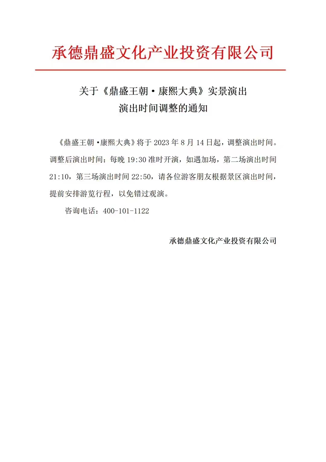 关于《鼎盛王朝·康熙大典》实景演出演出时间调整的通知