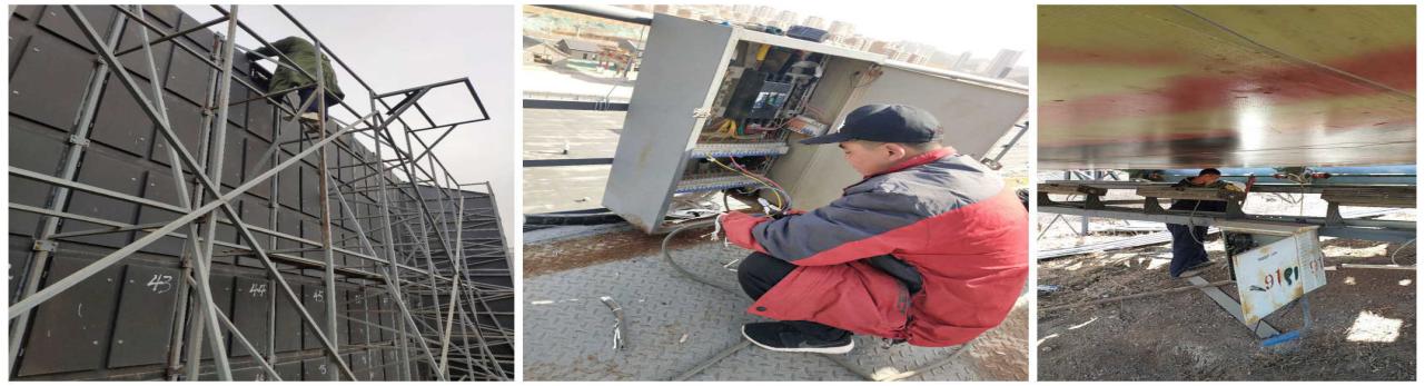 舞台大屏幕LED板更换维修,面光电箱与新灯组重新排线,山体景片的维修。