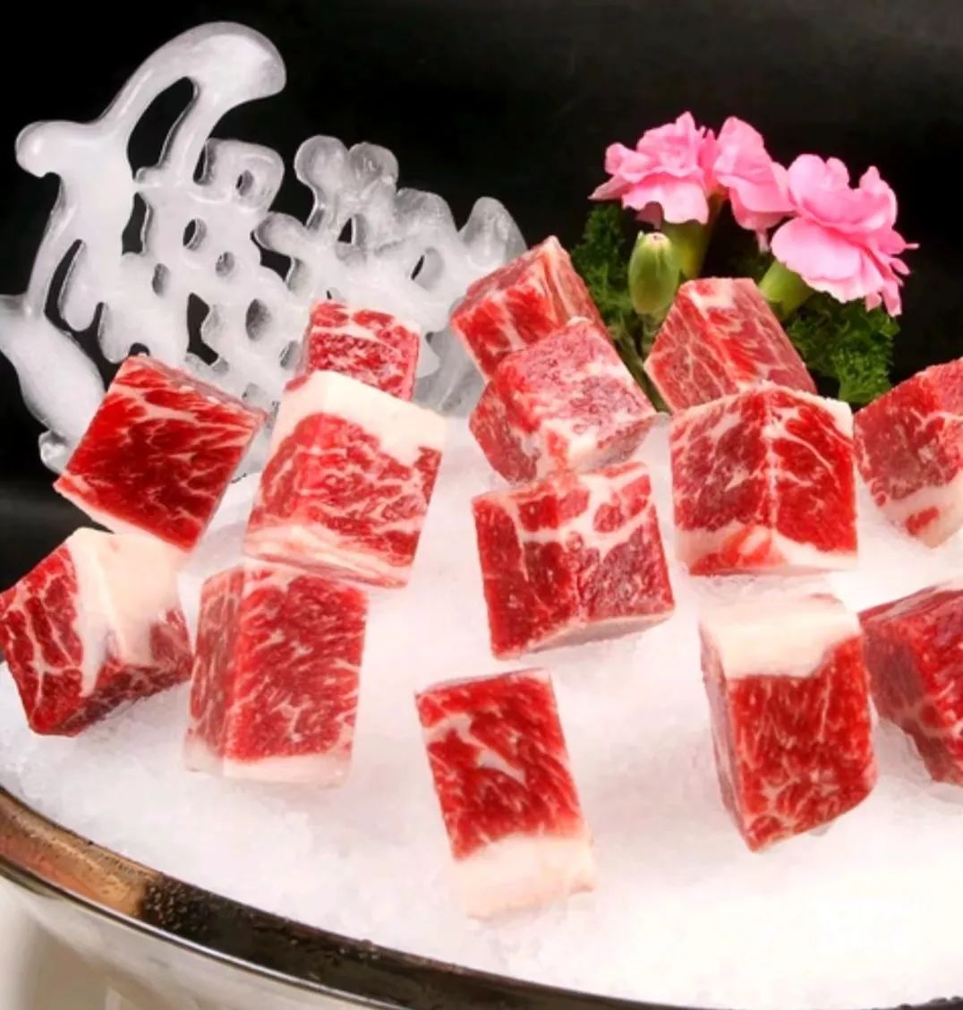 西冷肥牛:肉体呈大理石花纹,一头牛身体只有一块雪花肥牛,膏脂润滑,肥而不腻。