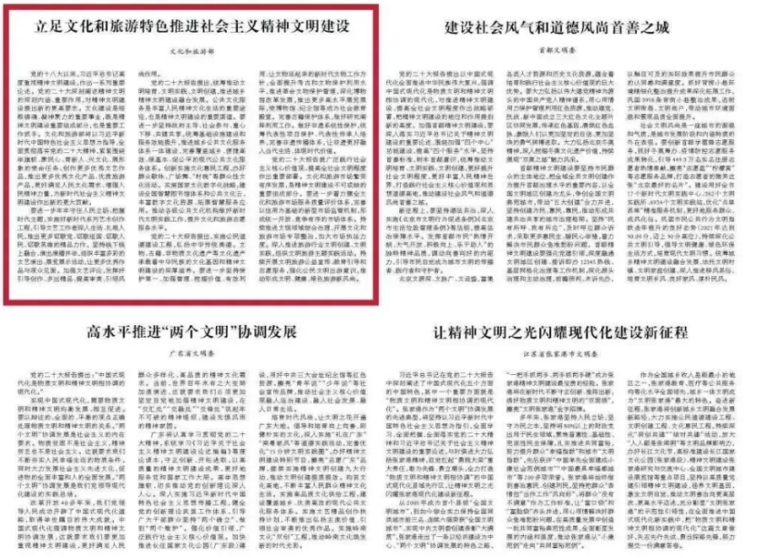 党的十八大以来,习近平总书记高度重视精神文明建设,作出一系列重要论述。党的二十大深刻阐述精神文明的深刻内涵、重要作用,对精神文明建设提出新的更高要求。文化建设是培根铸魂、凝神聚力的重要事业,既是精神文明建设重要组成部分,也是重要工作抓手。文化和旅游部将以习近平新时代中国特色社会主义思想为指导,全面贯彻落实党的二十大精神,紧紧围绕举旗帜、聚民心、育新人、兴文化、展形象的使命任务,创作更多优秀文艺作品,推出更多优秀文化产品、优质旅游产品,更好满足人民文化需求、增强人民精神力量,为新时代社会主义精神文明建设作出新的更大贡献。