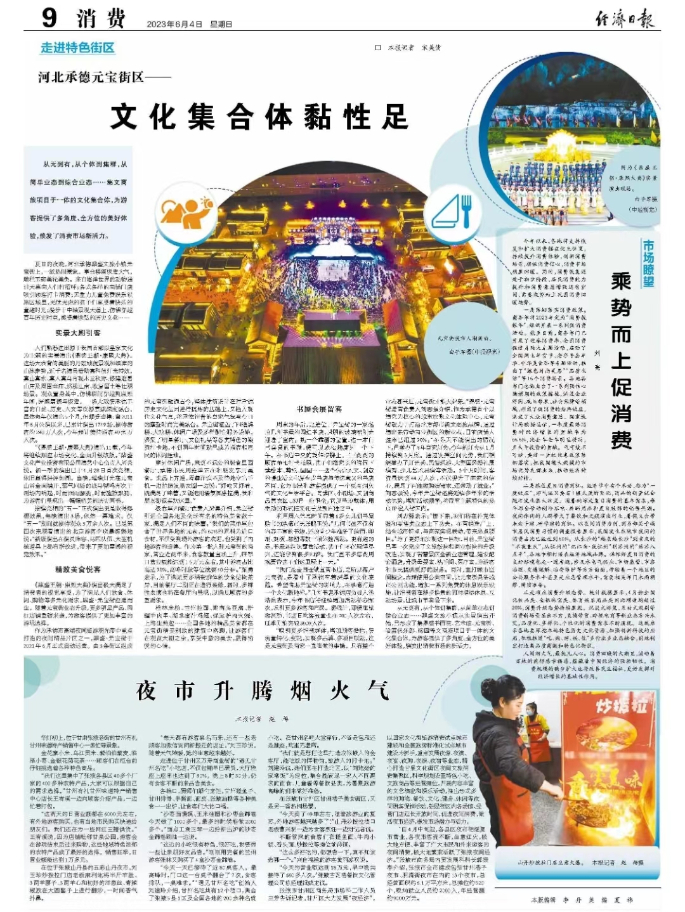 “吸引更多消费群体,增加顾客黏性,使流量转化、变现,实现多品牌、多项目联动,这是元宝街及商家一直在做的事情。只有整个业态都兴旺,元宝街才能火起来。”鼎盛·元宝街运营负责人刘志强介绍,作为承德首个以演艺为核心的城市欢聚文化体验中心,元宝街致力于打造北方都市新文商旅品牌,通过演出来带动商业街区的新业态,目前店铺入驻率已超过90%。“在冬天不能演出的情况下,已举办了8年皇家灯会,今年的灯会从1月持续到3月底。通过发挥空间优势,我们相继举办了灯光秀、民俗巡游、大型国风婚礼展演秀、少儿艺术展演等活动。3个月时间,客流量达到44万人次,不仅提升了商家的信心,满足了百姓游购娱需求,还带动了就业。”刘志强说,今年元宝街还将延续多年来的活动优势,增加活动频率,将带有主题特色的热点IP植入街区内。