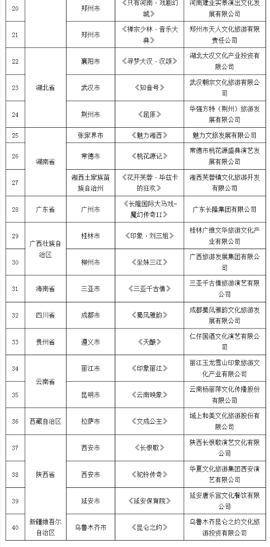 据了解,去年末,文化和旅游部产业发展司启动了全国旅游演艺精品名录申报工作,依托各地现有的文化内涵丰富、艺术精湛、社会效益和经济效益良好的旅游演艺项目,按实景类、剧场类、主题公园类、中小型特色类等4个类别开展遴选。在各省级文化和旅游行政部门推荐的申报项目基础上,经专家评审等工作程序,确定了40个全国旅游演艺精品名录拟入选项目。
