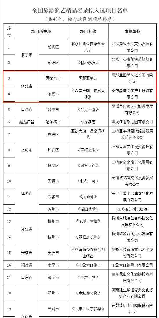 近日,文化和旅游部产业发展司发布《关于全国旅游演艺精品名录拟入选项目名单的公示》,我市《鼎盛王朝·康熙大典》项目入选。