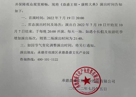 尊敬的各位游客: 经过紧张的排练和演出准备工作,大型实景演出《鼎盛王朝·康熙大典》定于2022年7月19日恢复演出。 一.首演时间:2022年7月19日 20:00 &nb...